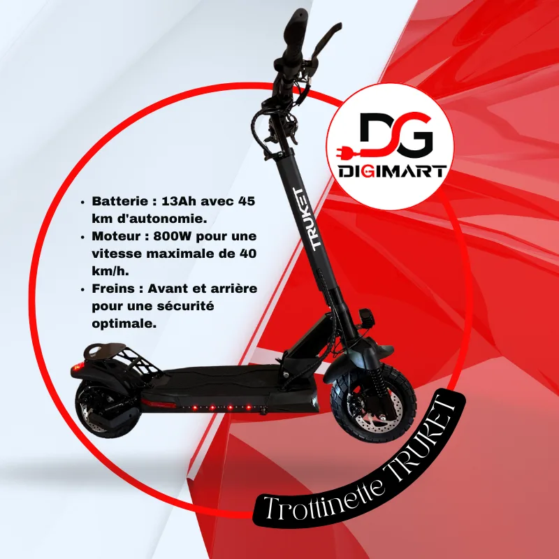 La trottinette TRUKET avec batterie 13Ah offrant 45 km d'autonomie, moteur 800W pour une vitesse de 40 km/h, et freins avant et arrière pour une sécurité maximale. Idéale pour vos trajets urbains."