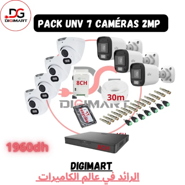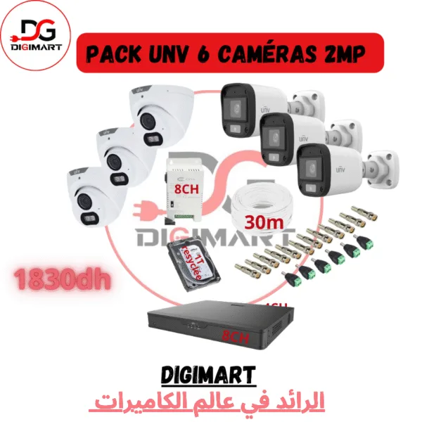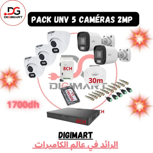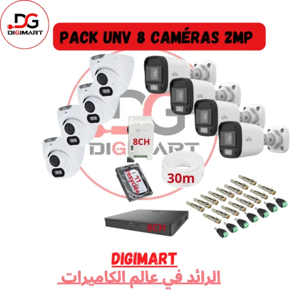 un pack UNV avec 3 caméras 2MP, incluant plusieurs composants pour une installation complète de vidéosurveillance.