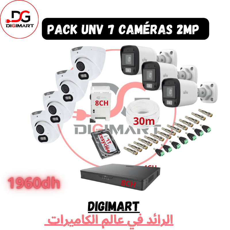 Voici une description détaillée du Pack UNV 7 caméras 2MP avec tous ses composants, conçu pour une installation de vidéosurveillance complète et de haute qualité.